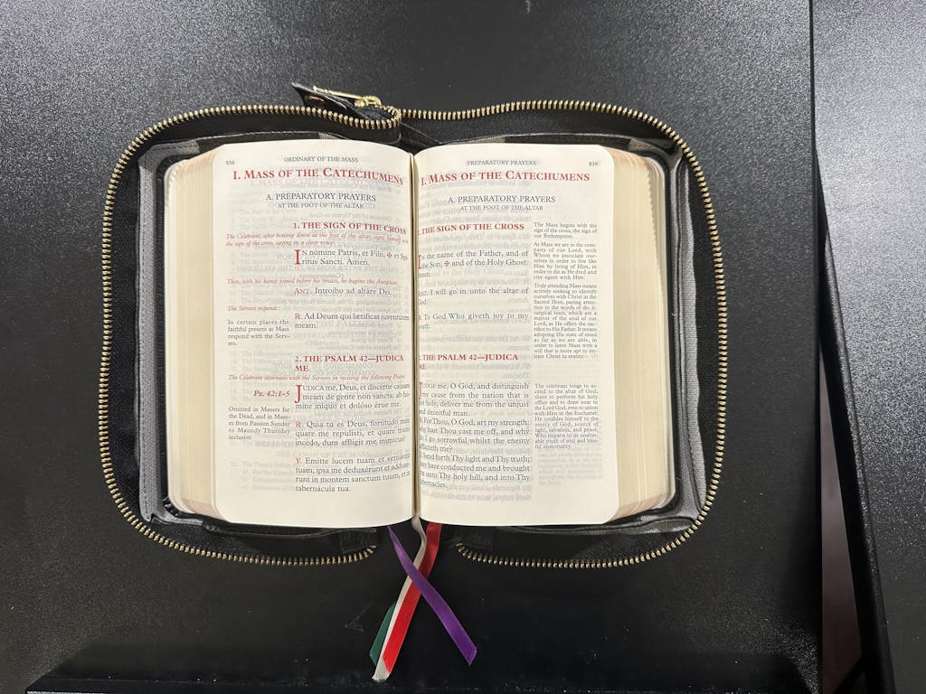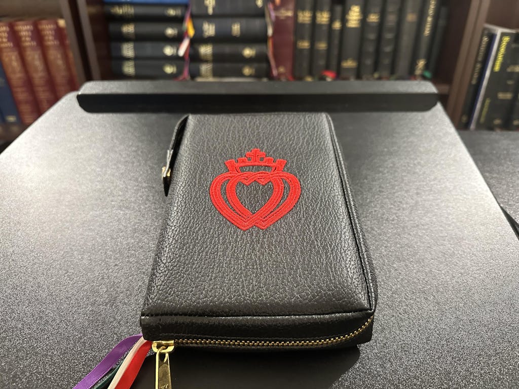 The double red hearts really stand out in the beautiful black cover. I was surprised how well the cover fits the missal. I thought it would be very tight and wouldn't be able to close the zipper, but I am well pleased to see that it fits perfectly with a bit of room all around. There is no problem closing the zipper and I love the fact that at the bottom left corner there is an opening where all the beautiful ribbons can come out of and hang out of the cover, so they don't get all bent and damaged. The cover is soft and leathery like. I am so happy that my missal is finally well protected. 😊